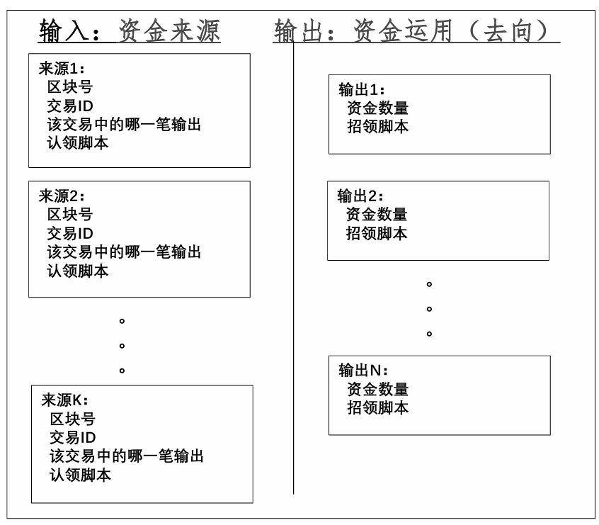 - 常规交易,有交易输入(支付者地址和金额)、交易输出(收入者地址和金额)