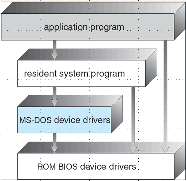 MS DOS 没有模块划分,以最少的空间提供最多的功能