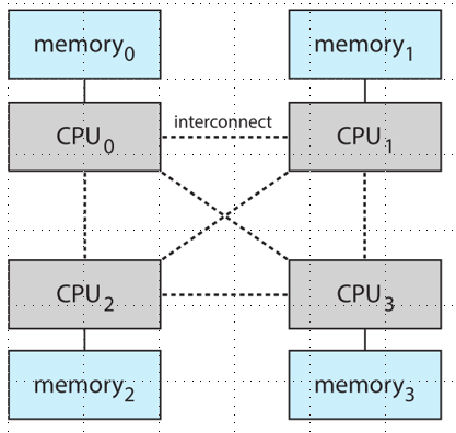 - 不同CPU通过共享的 system interconnect 连接