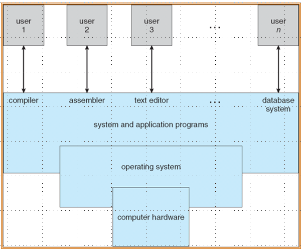 操作系统是用户和硬件的媒介,目标是执行用户的程序,让解决用户问题更简单,和使计算机系统方便使用。操作系统的层级如下图所示,可以有多个用户(Linux是真支持同时多用户,Win和Mac不是)使用。操作系统在系统和应用程序之下工作,严格意义上的操作系统就是指操作系统内核。