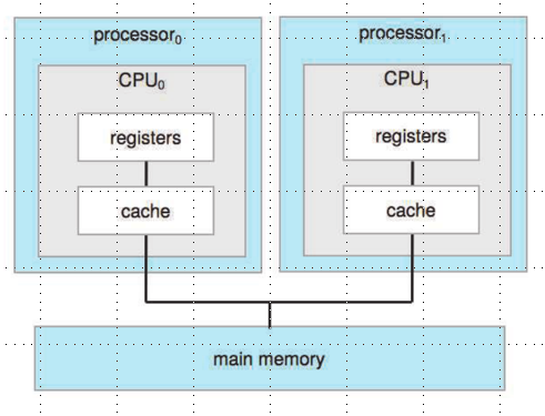 一个或多个CPU和设备控制器(device controller)通过公共总线连接,可以访问共享的内存,因而CPU和其它设备的并发(concurrent)执行会竞争内存。