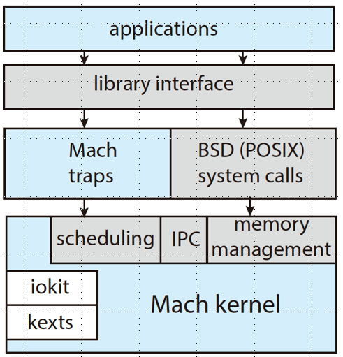 Darwin(mac和ios的底层)使用的是混合架构(微内核和宏内核),Mash 是微内核,BSD 是宏内核