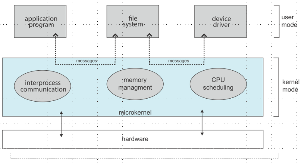 微内核(Microkernel)将尽可能多的功能移到了用户空间,用户模块之间通过 messaging passing 交流。微内核的优点如下: