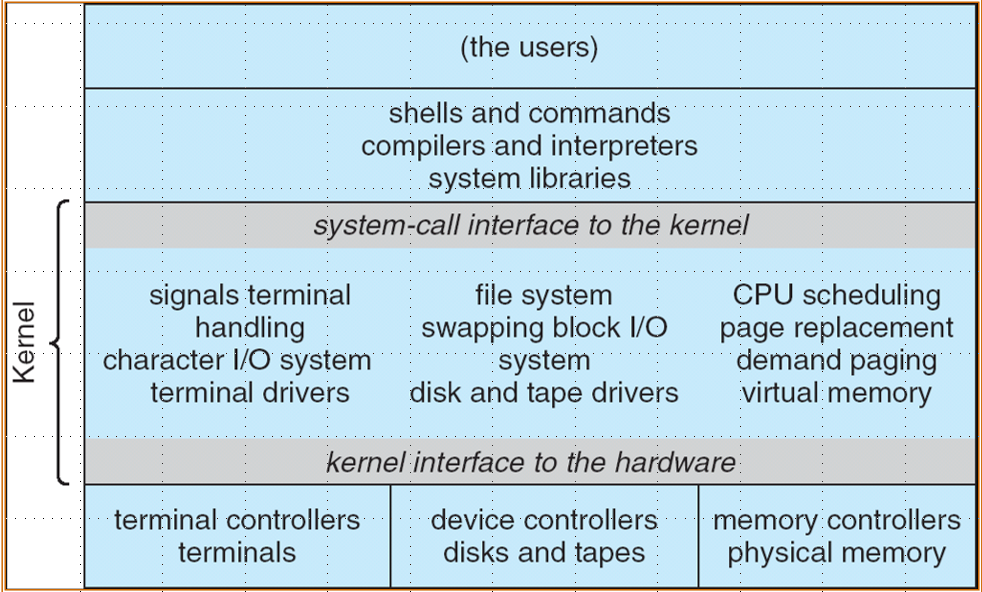 - The kernel:包含系统调用之下,硬件之上的所有内容