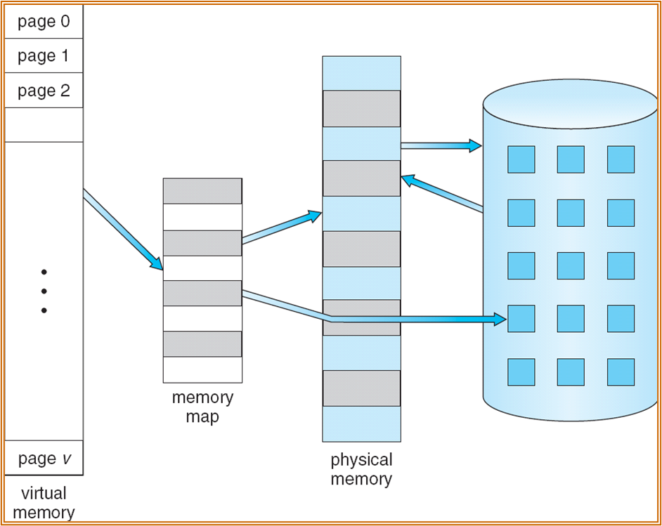 虚拟内存隔离了用户的逻辑地址和物理地址,多个进程可以同时在内存中执行和高效地创建。虚拟内存可以比物理内存大,因为只有部分程序在内存中,且存在换入换出操作