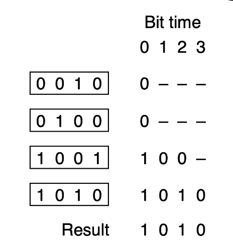 当站点数量特别庞大时,基本位图协议和令牌环协议的等待时间是很长的,所以需要设法改进。在二进制倒数协议中,如果一个站想要使用信道,则需要先以二进制形式广播自己的地址(假设传播时延可忽略),仲裁规则如下:要发送数据的站点从左到右对比收到的地址和自己的地址,如果发现某一位在收到的地址中为1,而在自己的地址中为0,它就必须放弃竞争。这个协议中存在优先级:高序号比低序号优先。