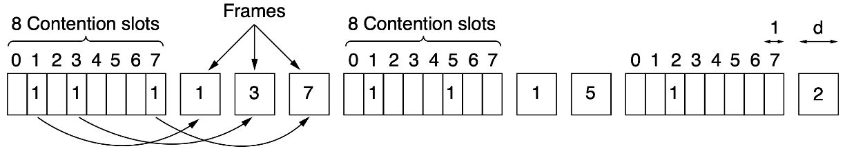 每个竞争期正好有N个槽,如果第$i \(个站有帧要发,则它在第\)i $号槽中传输1位,当N个槽都经过后,每个站都完整知道了哪些站希望传输数据,这时,它们便按照顺序开始传输数据了。像这样在传输之前先广播自己有传输意愿的协议称为预留协议(Reservation Protocol)。