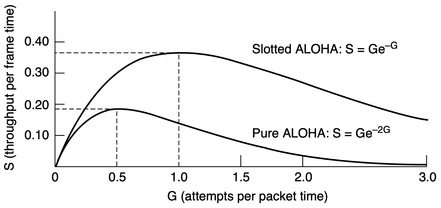 PURE-ALOHA 的最好信道利用率为$\frac{1}{2e} \(,而SLOTTED-ALOHA的最好信道利用率为\)\frac{1}{e} $