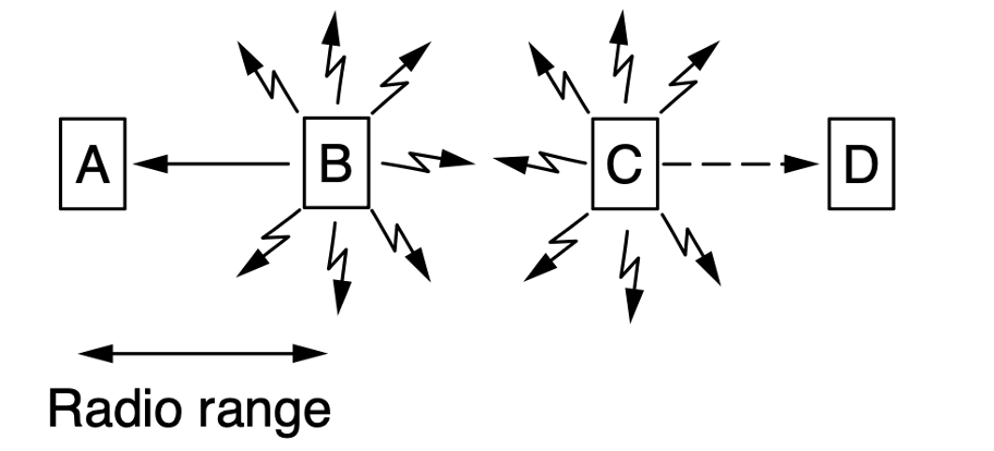 暴露终端问题如下图,B向A发送数据和C向D发送数据是不冲突的,但是B和C会由于检测到对方正在发送,而误以为发生了冲突