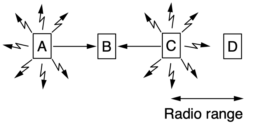 隐藏终端问题如下图,A和C不在彼此的通信范围内,它们同时向B发送信息,是检测不到冲突的。