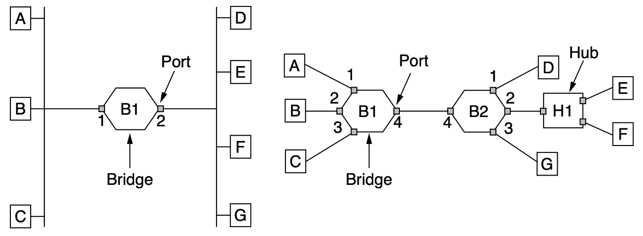 网桥是用来划分网段(冲突域)的设备,因为同一个集线器连接的是一个冲突域,如果只用集线器扩大网络,冲突域将越来越大,而网桥工作在数据链路层,可以根据mac地址去转发消息,从而隔离出不同冲突域。不过网桥实际已经被交换机淘汰。