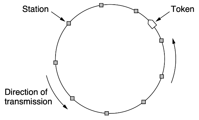 在令牌环协议中,一个环(Token)沿着环形总线在各站之间依次传递,令牌是一个特殊的控制帧,本身并不包含信息,仅控制信道使用,当环上的一个站点希望发送帧时,必须等待令牌。