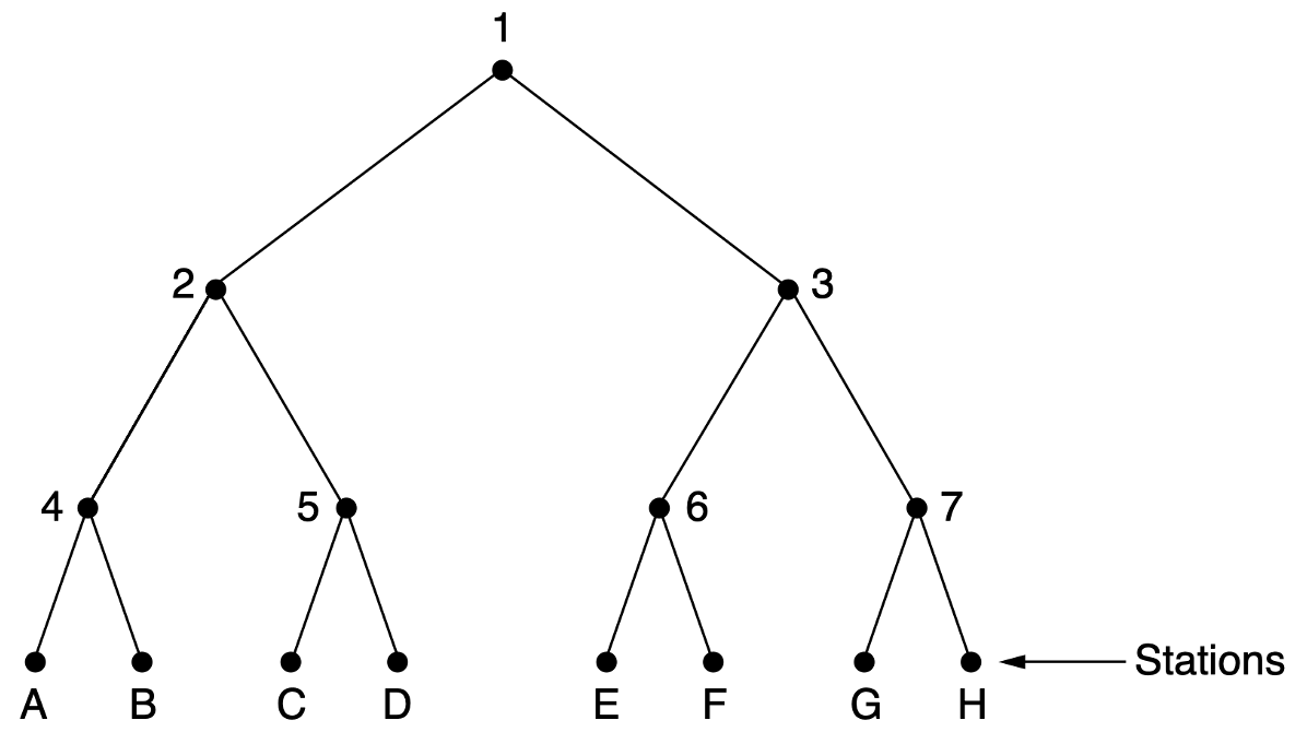 自适应树形遍历协议将站点看做一颗二叉树的叶子节点,在一次成功的传输之后的第一个竞争槽,即0号槽中,允许所有站点尝试获得信道,如果它们中的一个获得了信道,那很好;但如果发生了冲突,则只有2号槽中的站点可以参与竞争,如果其中的一个站点获得了信道,那么下一个槽就保留给了3号节点,否则继续DFS找到就绪站。